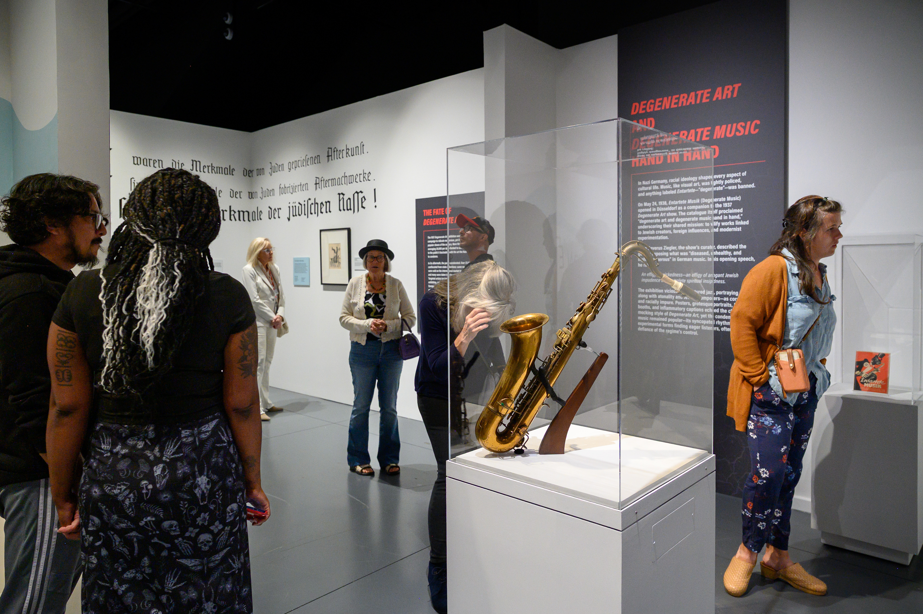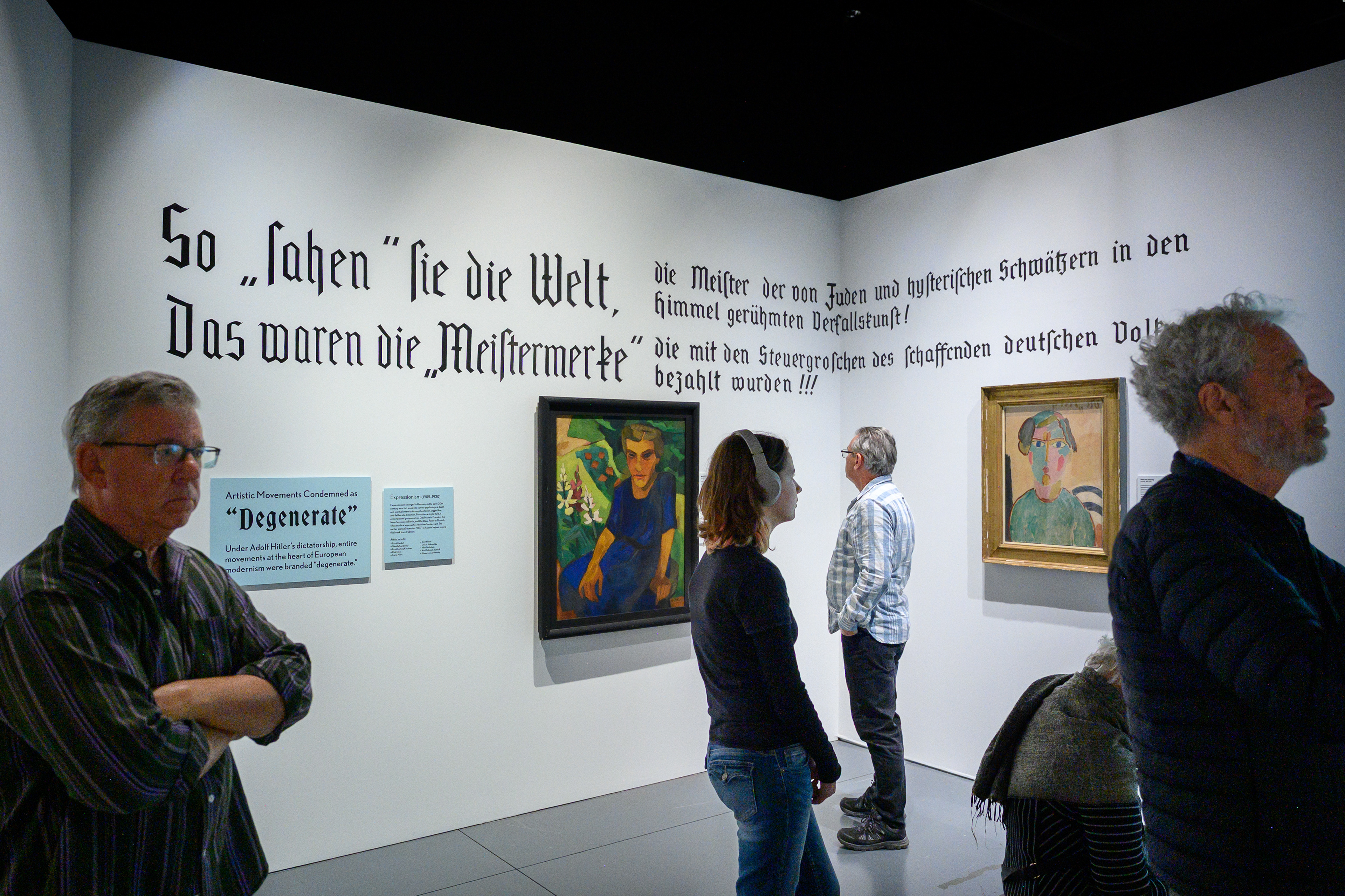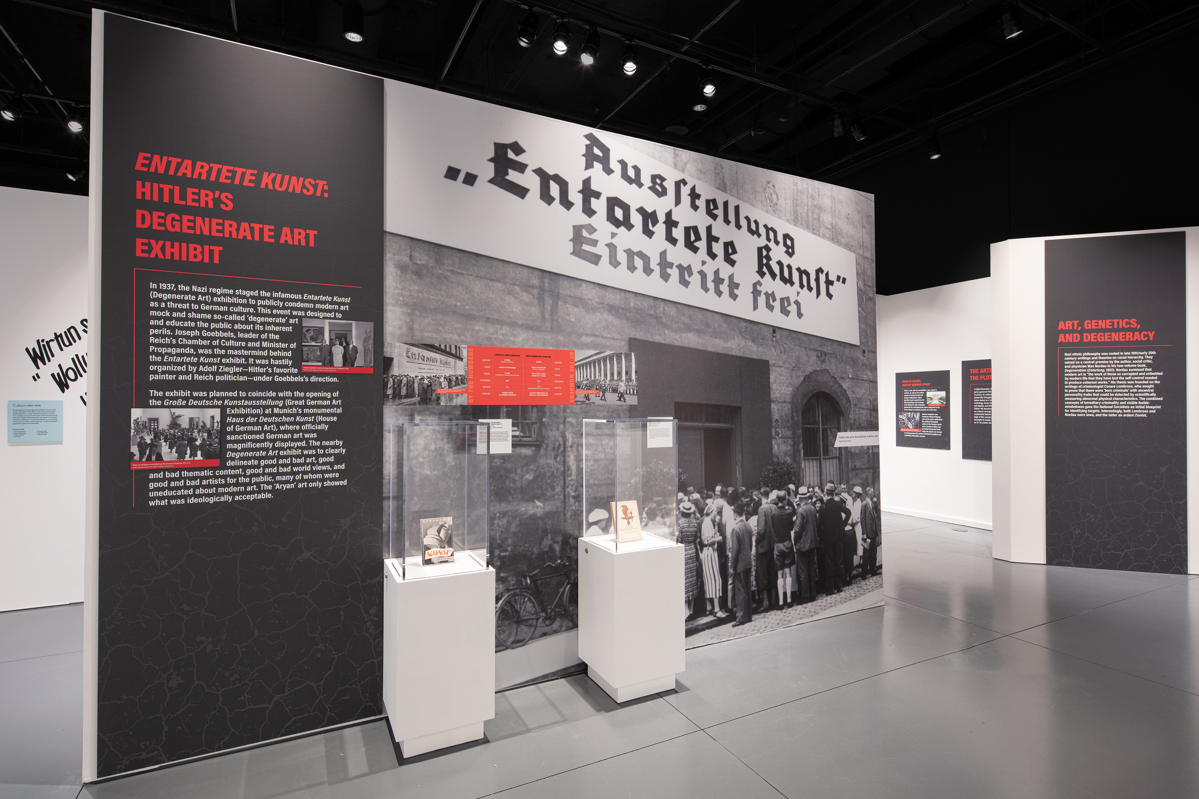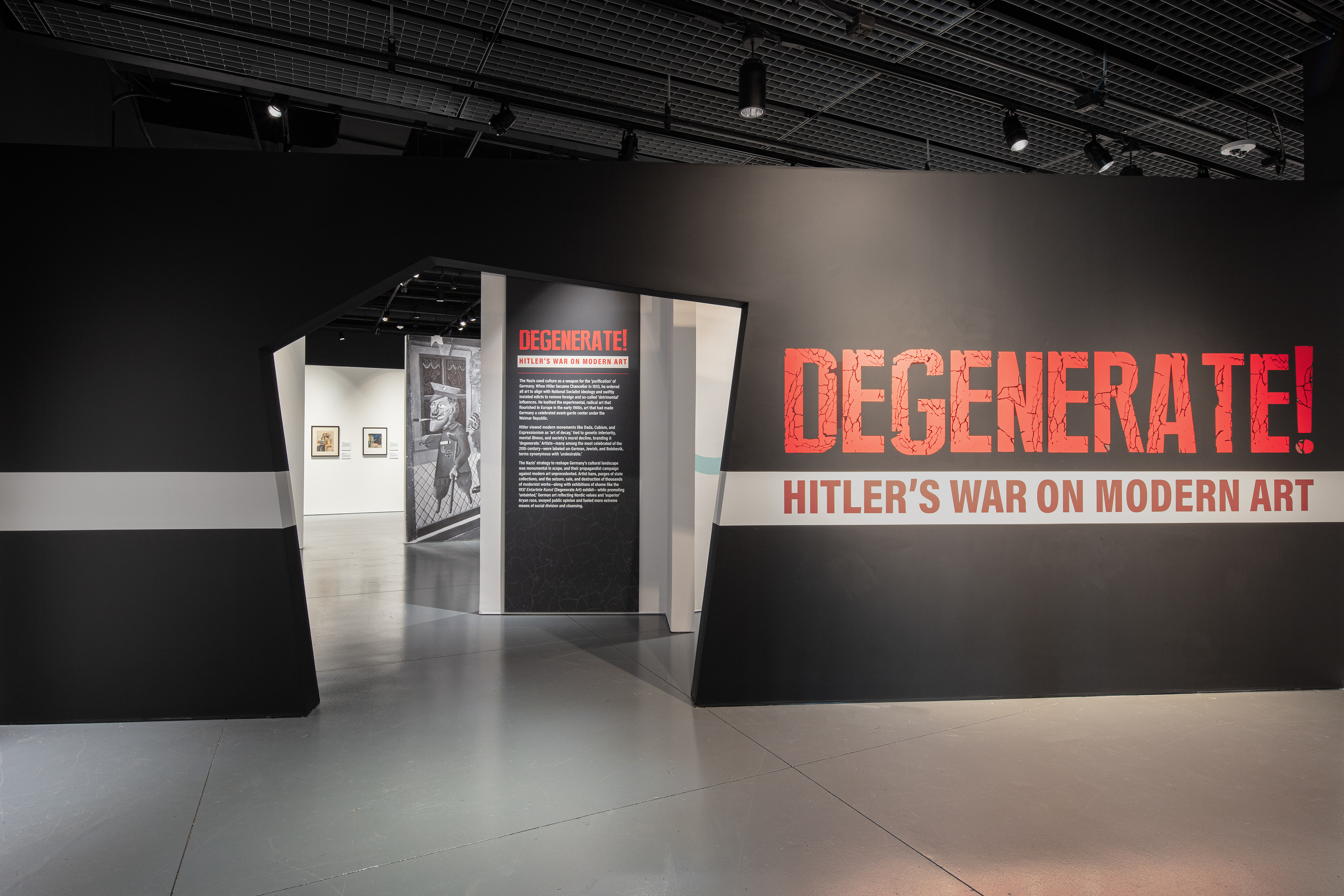 Originally created by and on loan from the Jewish Museum Milwaukee, this traveling exhibition, Degenerate! Hitlers War on Modern Art examined the Nazi campaign against modern art and music. It featured works by artists deemed “degenerate” by the Third Reich, as Nazi propaganda and public indoctrination weaponized nonconformist cultural expression during their rise to power. To better accomodate the gallery space, modifications were made to the original exhibitions’ floorplan, labels, timeline graphic, and narrative display. A replication of the actual 1937 exhibition, Entartete Kunst, can be found within the Degenerate! exhibit, giving the visitors a taste of how these artworks were displayed. Utilizing archival images from the 1937 show, the walls of the replicated exhibition contained hand-painted murals of messaging from the Nazi party. To provide the audience an interactive experience, a period-accurate stereo was used to share “degenerate” music via iPad and inset speakers. Visitors were able to share their thoughts on the exhibition in the comment books as they exited the exhibition. This traveling exhibition debuted in the Senator John Alario, Jr. Special Exhibit Gallery at The National WWII Museum.