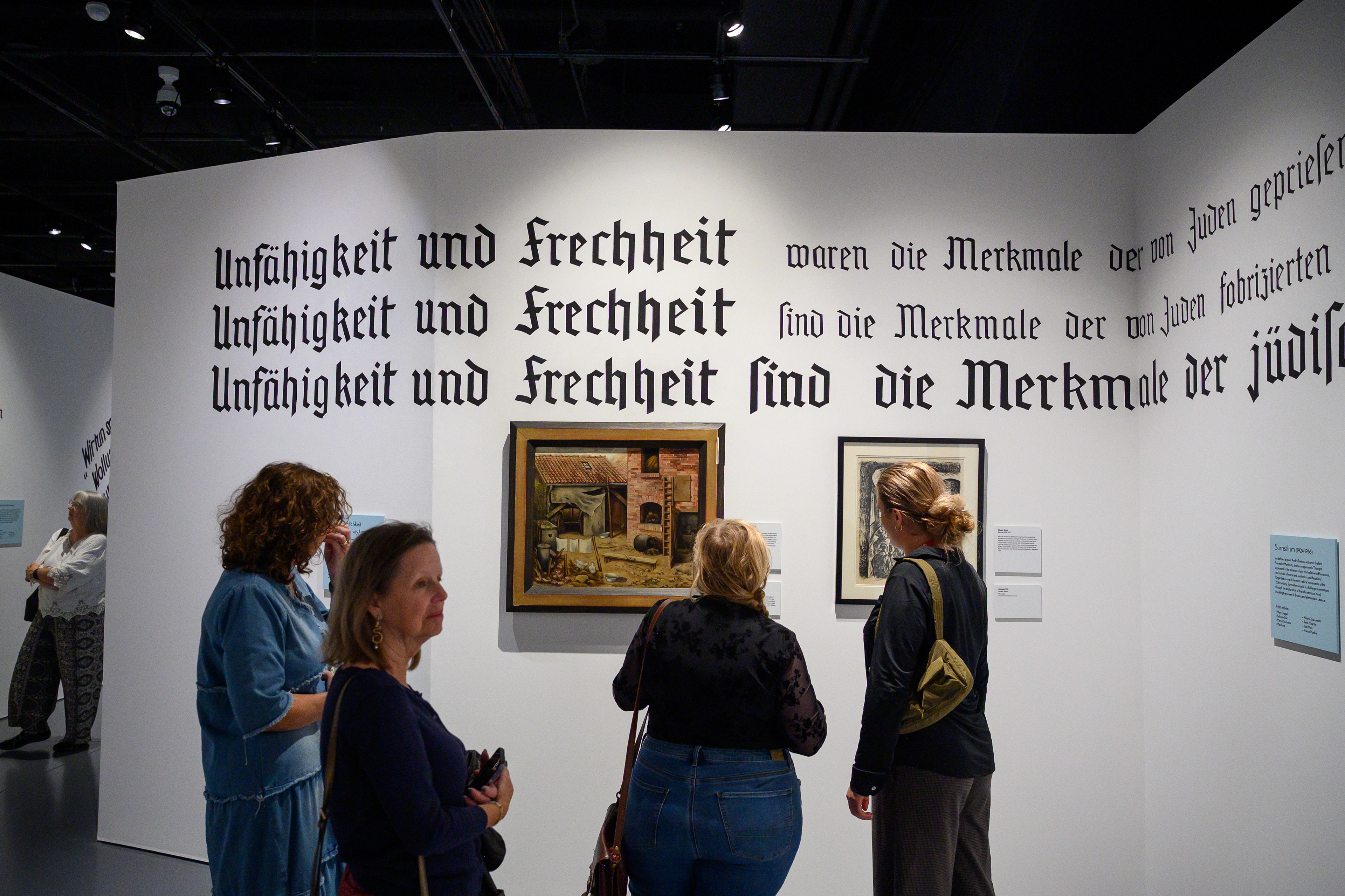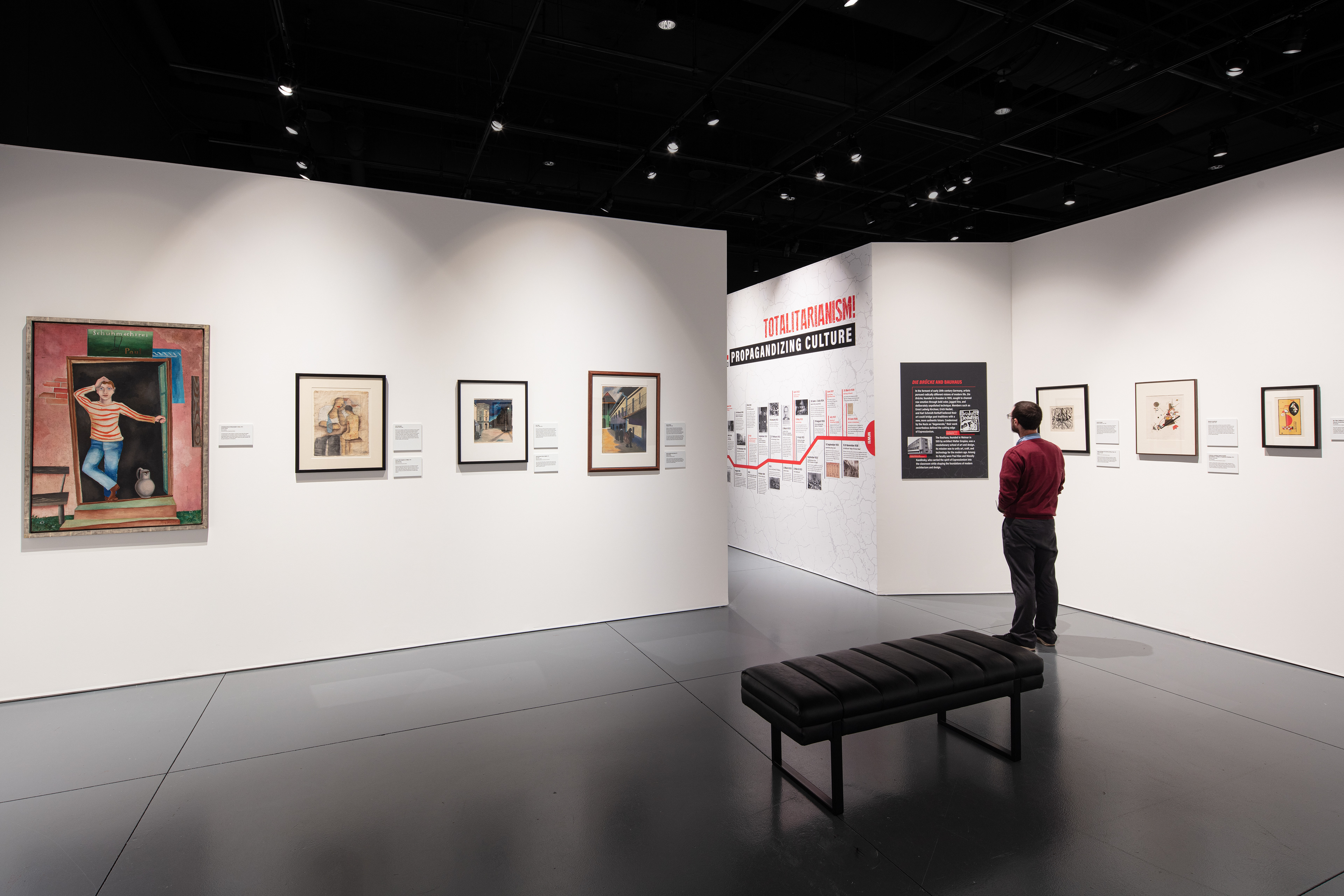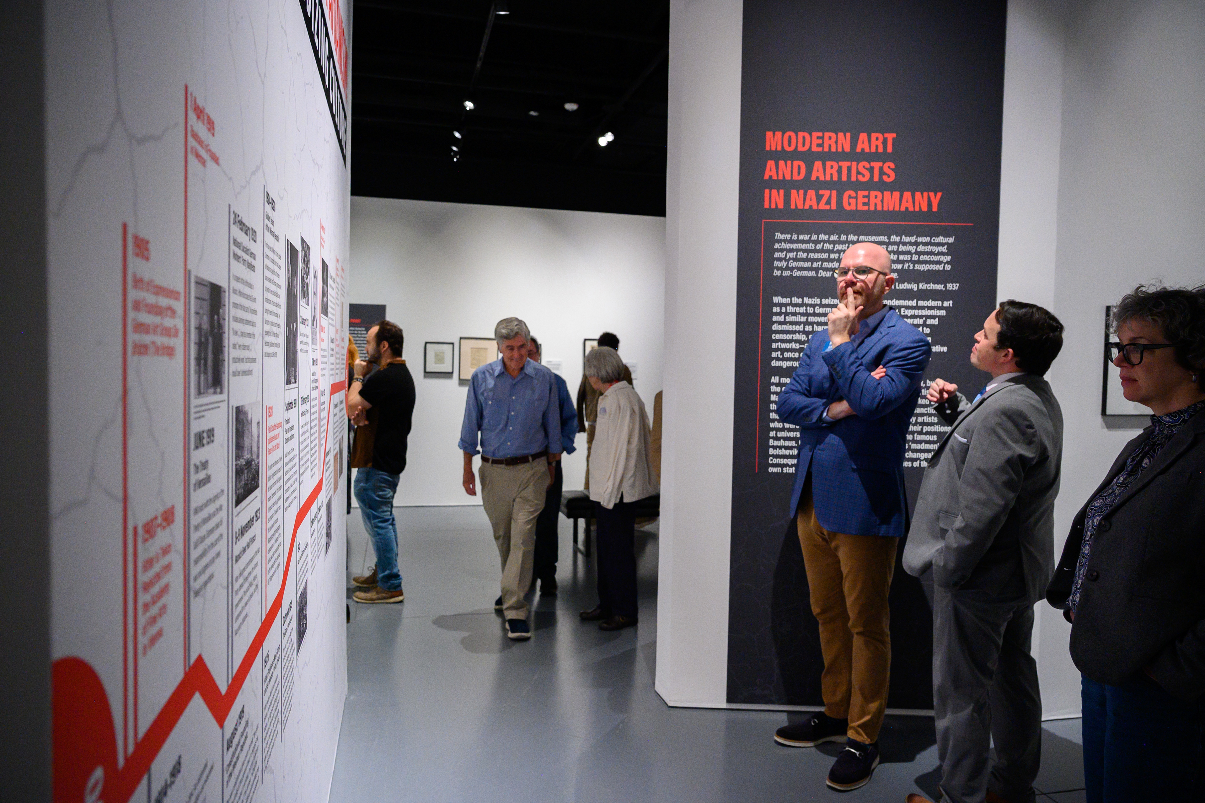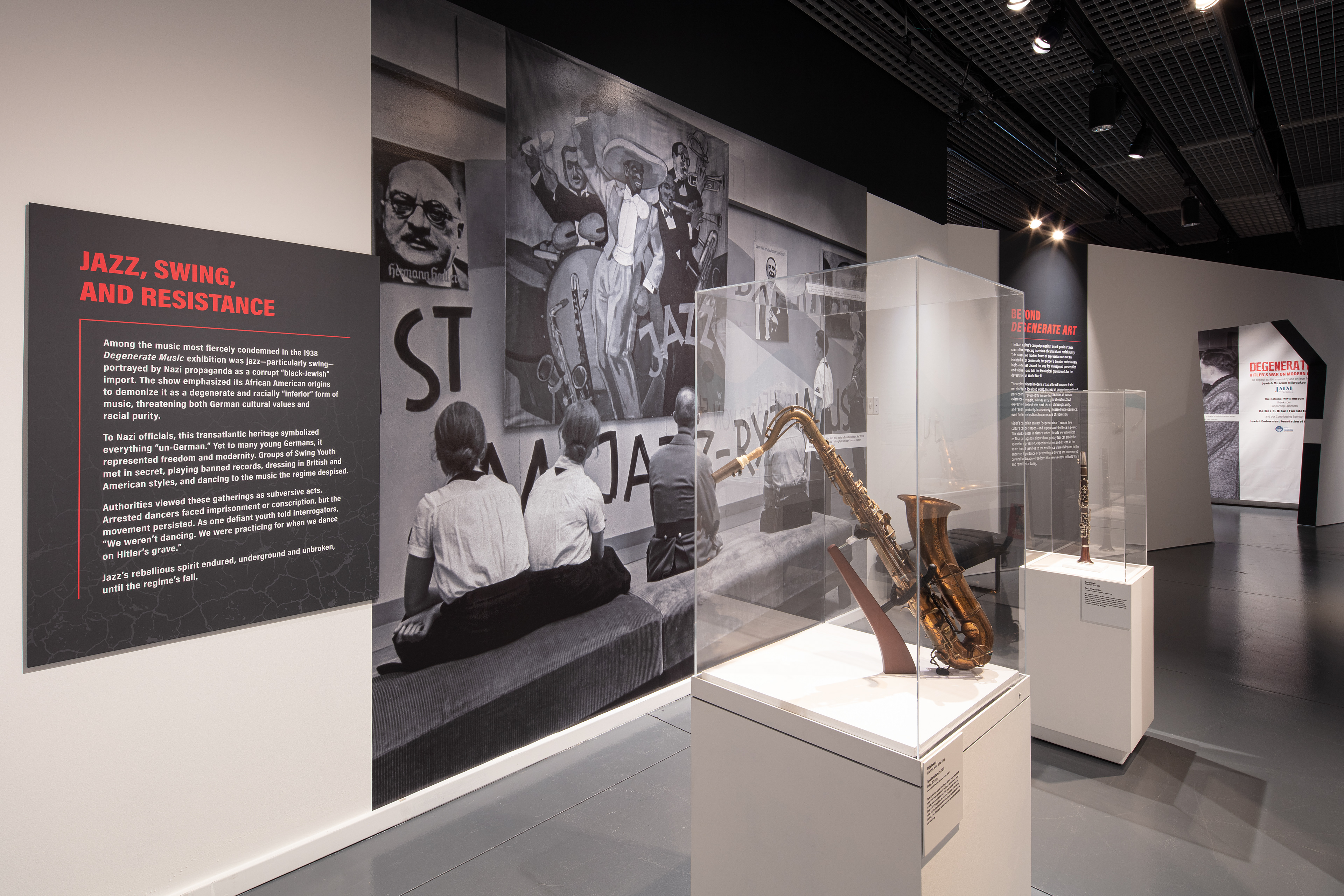 Originally created by and on loan from the Jewish Museum Milwaukee, this traveling exhibition, Degenerate! Hitlers War on Modern Art examined the Nazi campaign against modern art and music. It featured works by artists deemed “degenerate” by the Third Reich, as Nazi propaganda and public indoctrination weaponized nonconformist cultural expression during their rise to power. To better accomodate the gallery space, modifications were made to the original exhibitions’ floorplan, labels, timeline graphic, and narrative display. A replication of the actual 1937 exhibition, Entartete Kunst, can be found within the Degenerate! exhibit, giving the visitors a taste of how these artworks were displayed. Utilizing archival images from the 1937 show, the walls of the replicated exhibition contained hand-painted murals of messaging from the Nazi party. To provide the audience an interactive experience, a period-accurate stereo was used to share “degenerate” music via iPad and inset speakers. Visitors were able to share their thoughts on the exhibition in the comment books as they exited the exhibition. This traveling exhibition debuted in the Senator John Alario, Jr. Special Exhibit Gallery at The National WWII Museum.