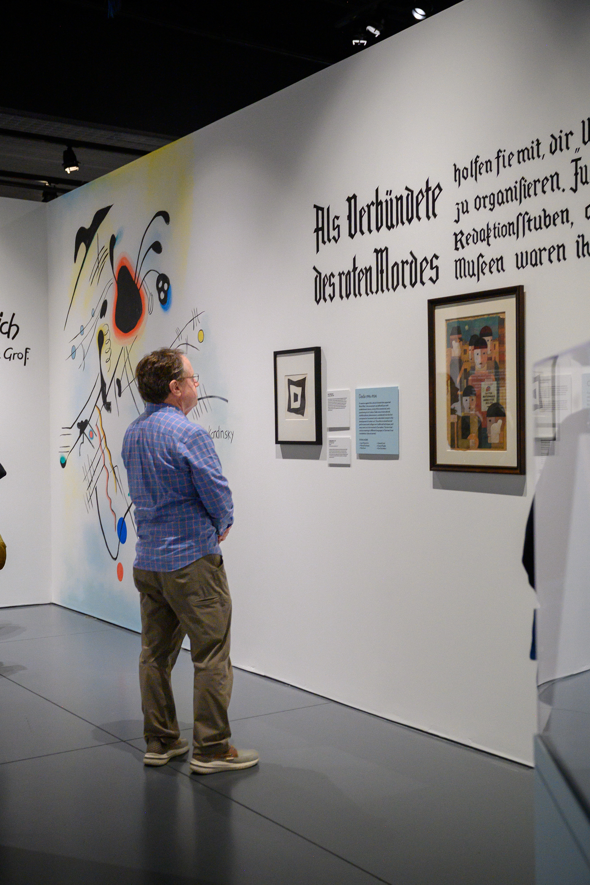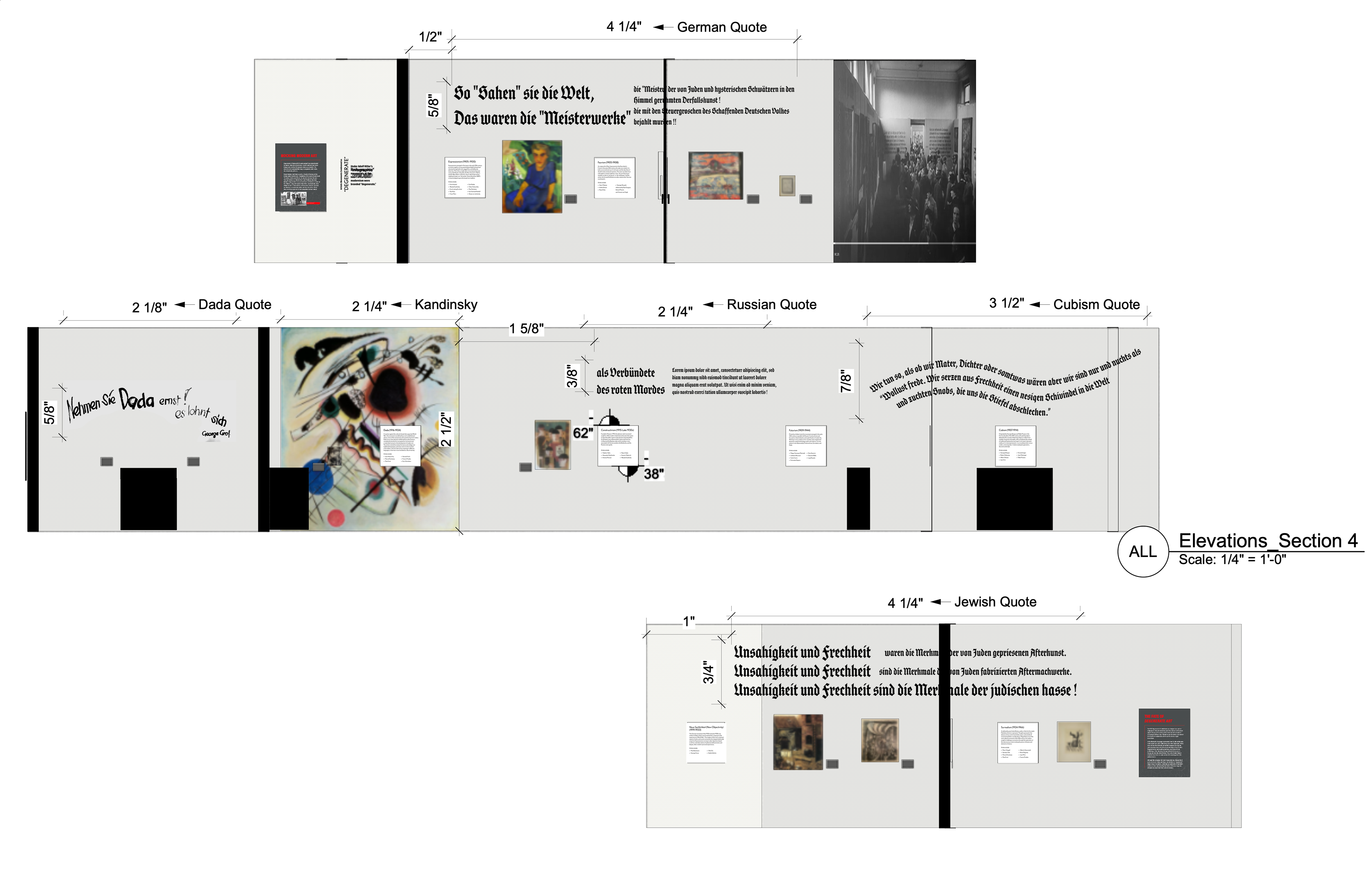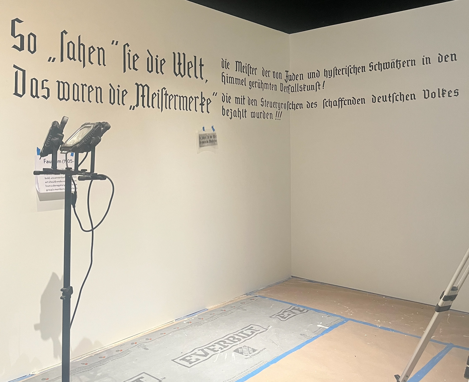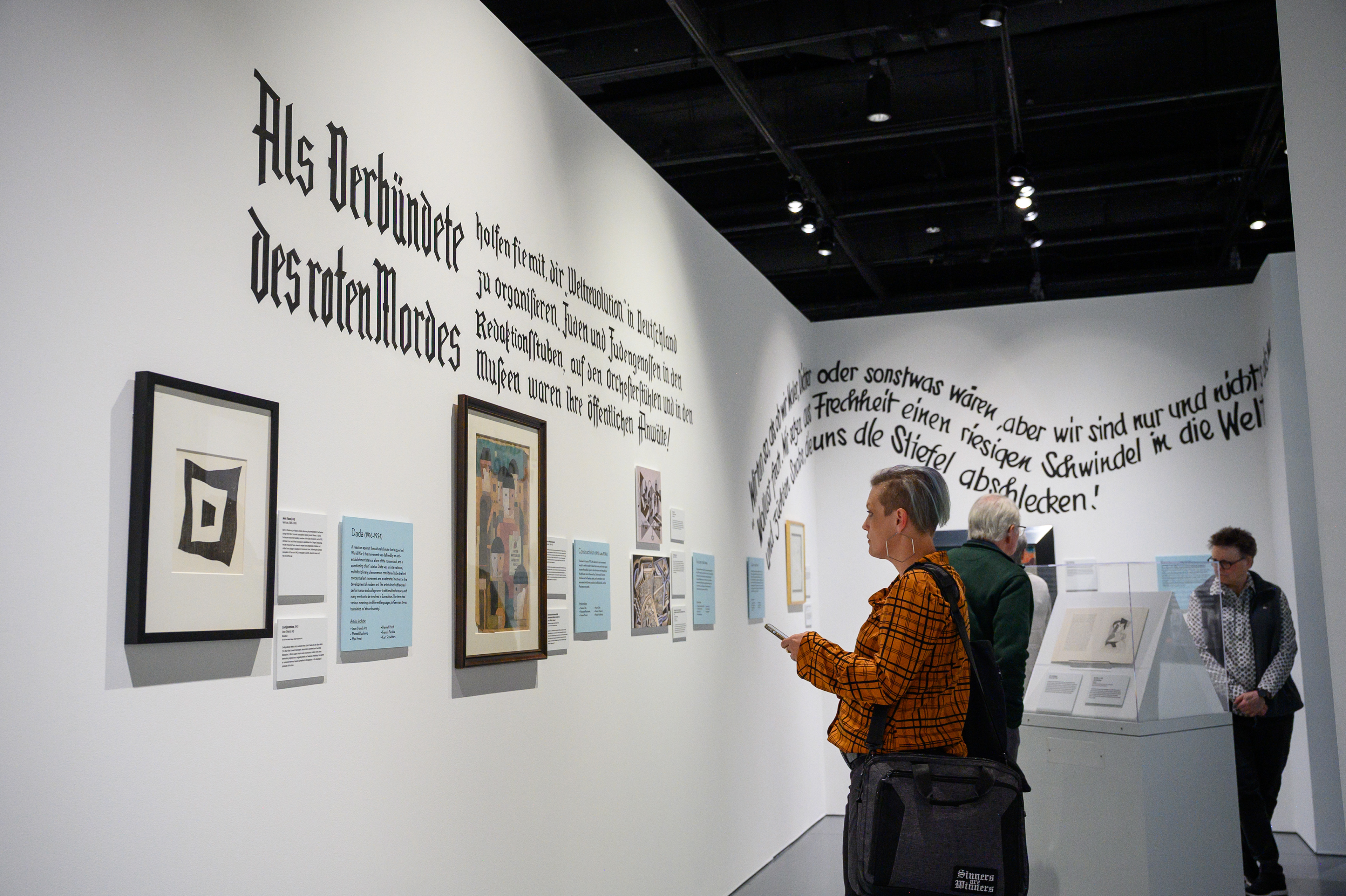 Originally created by and on loan from the Jewish Museum Milwaukee, this traveling exhibition, Degenerate! Hitlers War on Modern Art examined the Nazi campaign against modern art and music. It featured works by artists deemed “degenerate” by the Third Reich, as Nazi propaganda and public indoctrination weaponized nonconformist cultural expression during their rise to power. To better accomodate the gallery space, modifications were made to the original exhibitions’ floorplan, labels, timeline graphic, and narrative display. A replication of the actual 1937 exhibition, Entartete Kunst, can be found within the Degenerate! exhibit, giving the visitors a taste of how these artworks were displayed. Utilizing archival images from the 1937 show, the walls of the replicated exhibition contained hand-painted murals of messaging from the Nazi party. To provide the audience an interactive experience, a period-accurate stereo was used to share “degenerate” music via iPad and inset speakers. Visitors were able to share their thoughts on the exhibition in the comment books as they exited the exhibition. This traveling exhibition debuted in the Senator John Alario, Jr. Special Exhibit Gallery at The National WWII Museum.